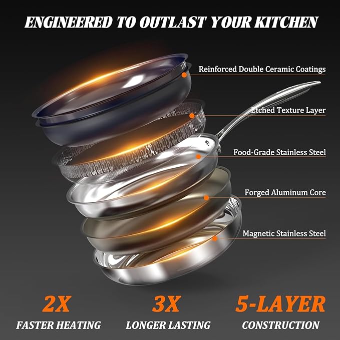 - Rapid & Even Heat Distribution: Built with a fully clad, hybrid 3-ply stainless steel core and 2-layer ceramic coatings, this frying pan heats up quickly and distributes heat evenly across the entire cooking surface. The inner aluminum core is sandwiched between two layers of stainless steel, eliminating hot spots. Perfect for searing a steak to a crust while locking juices inside or cooking an evenly-cooked, delicate omelet