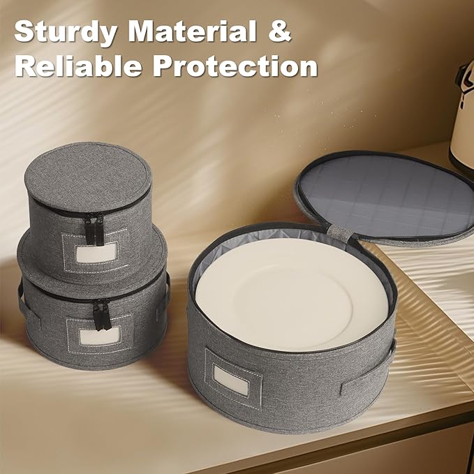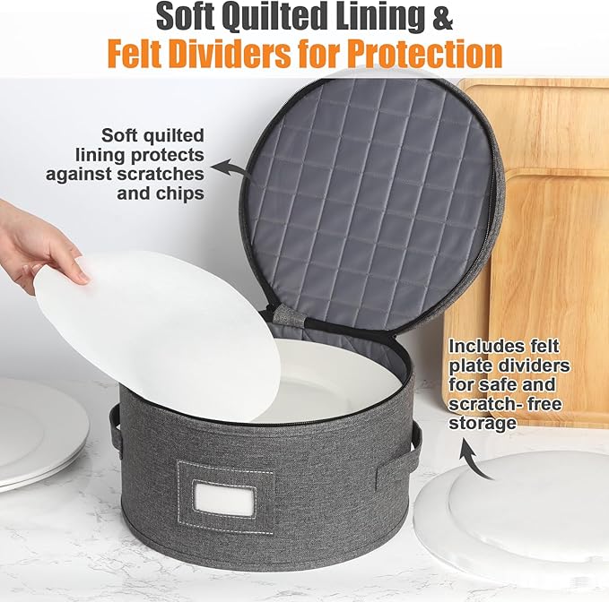 - DURABLE PLATE STORAGE WITH FELT DIVIDERS: Our plate storage containers feature a soft quilted lining and felt dividers that keep porcelain and fine china separated to prevent scratches or chips. These sturdy china storage container set reduce the risk of breakage and keep your dinnerware in pristine condition, making them the ideal dish storage containers for long-term care.