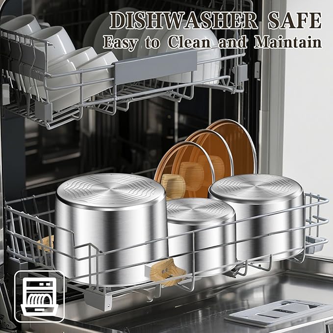 - [Easy Cleaning & Care Instructions] For long-lasting performance, hand wash the nonstick frying pans with a soft sponge; avoid abrasive scouring pads or steel wool to protect the coating. The saucepots and stockpot are dishwasher-safe, making cleanup quick and convenient.