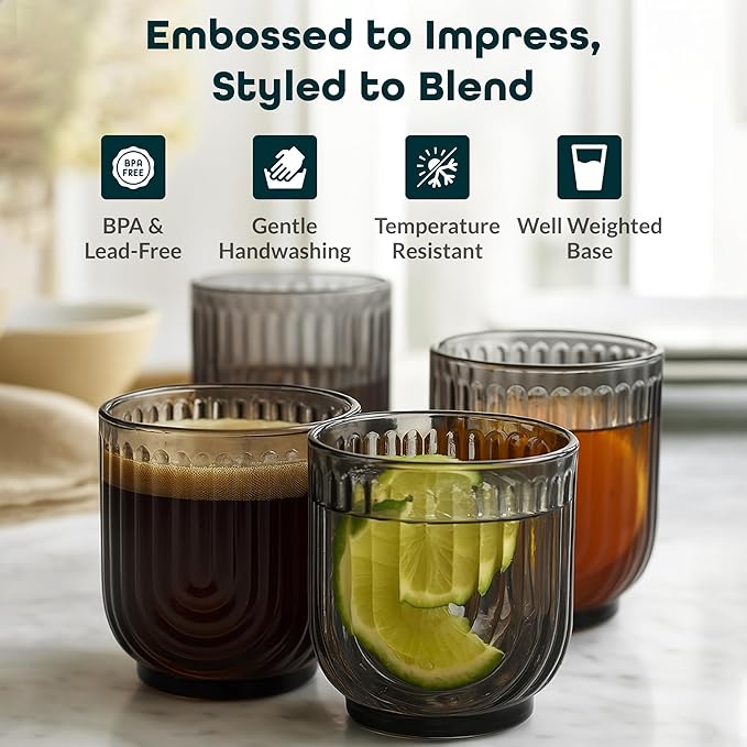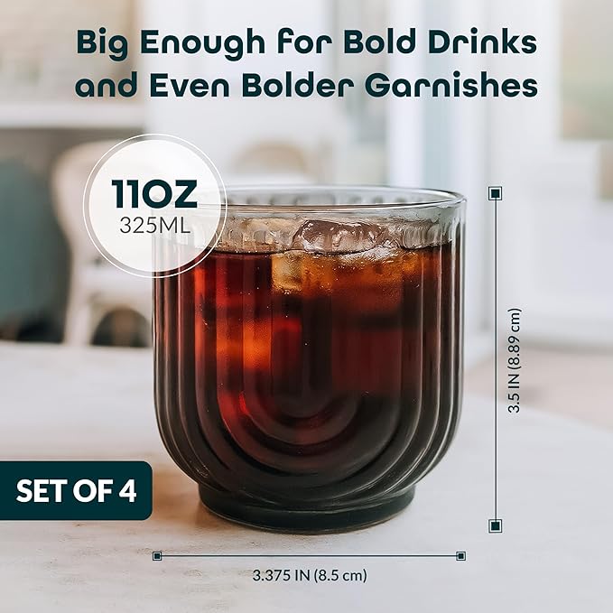 Glaver's Double Old Fashioned Rock Glasses, Set of 4 Smoke Black Whiskey Glasses, 11 oz Art Deco U-Shape Design Embossed Everyday Home Bar Glassware. Art Deco Elegant Kitchen Drinking Glasses.