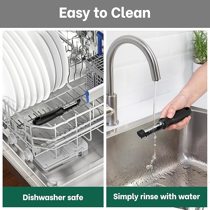 - Easy to Clean & Easy to Store: Hassle-free cleaning! The smooth blades resists clog with peels! This peeler is both dishwasher-safe and easy to rinse clean with water. The handy hook hole allowing you to hang it within convenient reach, also it easy to store in your kicthen utensil drawer