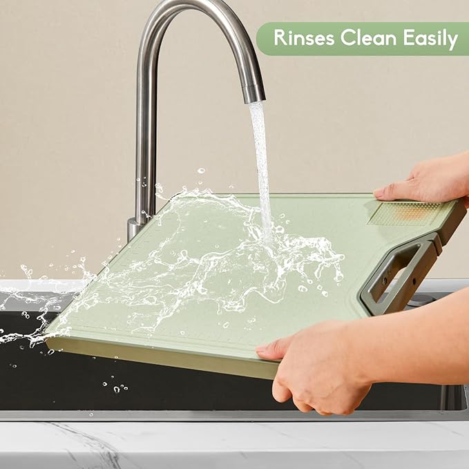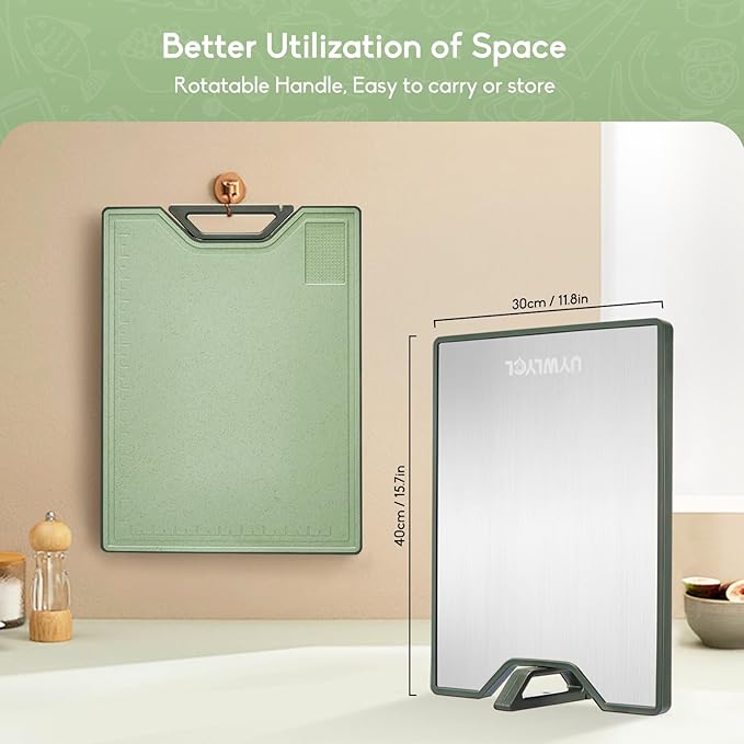 - 【Easy to Clean & Space-Saving Storage】Thanks to its non-toxic, smooth surfaces, this board wipes clean in seconds — just rinse with water or hand wash. the rotating handle lets it stand upright for quick drying and less counter clutter. plus, a built-in hanging hole makes wall storage simple.