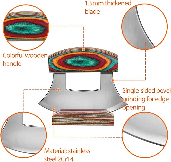 Pizza Cutter Rocker Knife, Sharp Ulu Knife with Wooden handle, Stainless Steel Blade Mincing Knives with Colored Wood Stand