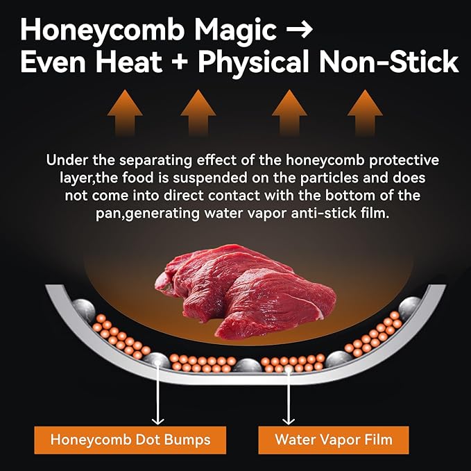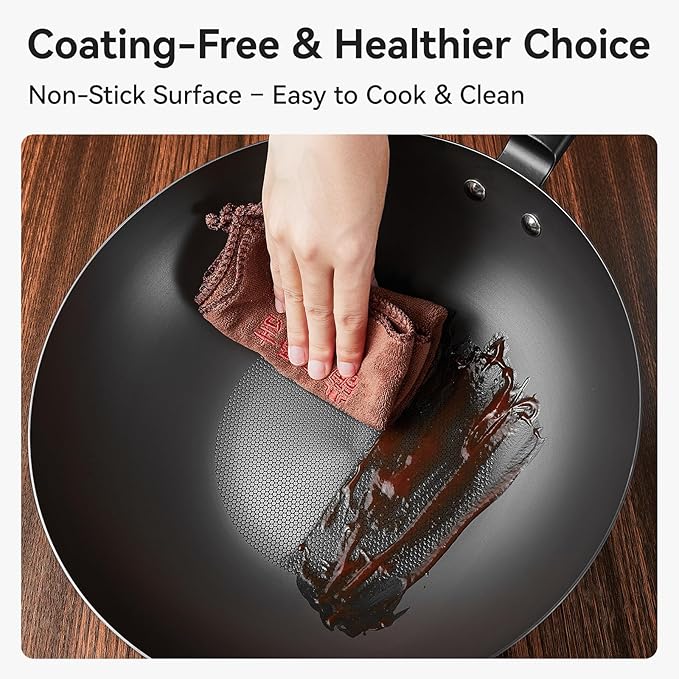 - Lightweight & quick-heating: Pan weight ≈2.51 lb (1.14 kg) for easy one-hand tossing; responsive iron is great for stir-frying, searing and sautéing. Micro-mesh texture supports physical nonstick when properly preheated.