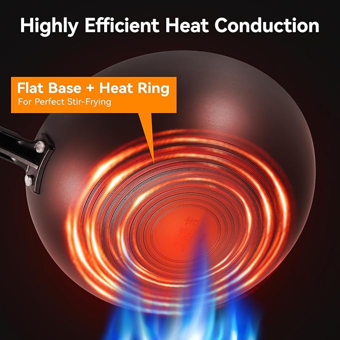 - Flat bottom for induction & more: Stable 6.3" base works on induction, gas, electric and ceramic cooktops. At very high induction power, the base may show a brief flex/wobble; add food or reduce power and it settles. Gas flame does not cause this.