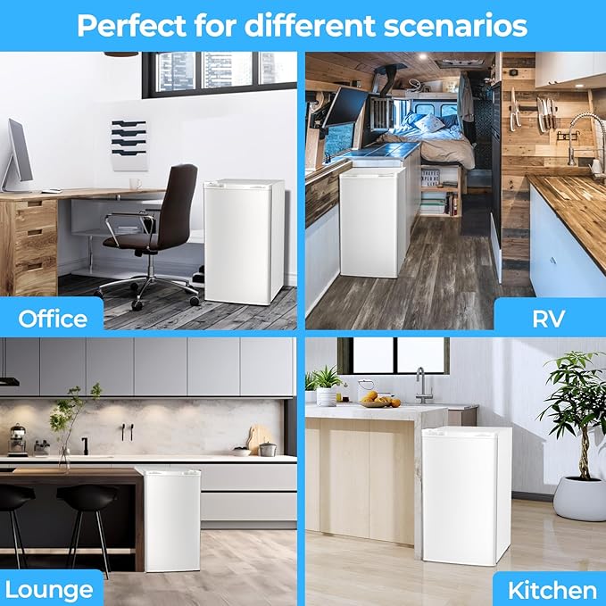 - Golden capacity, compact and does not take up space: 2.90cu.ft refrigeration & 0.30cu.ft freezing dual-zone configuration, scientific division of fresh and frozen space; 17.52"W x 19.09"D x 31.3"H, small space can also realize large-capacity storage.