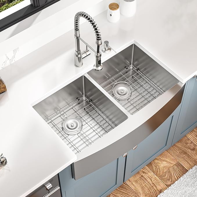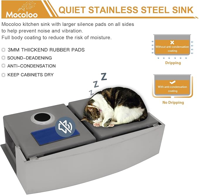 - Fast Drainage & Quiet Sink: Mocoloo farmhouse double bowl kitchen sink with an X-shaped groove design and sloped bottom for more rapid drainage. The 3 mm-thick rubber pads and coating on the back are added to absorb noise and vibration, which helps prevent condensation on this stainless double bowl kitchen sink, thereby protecting your cabinet