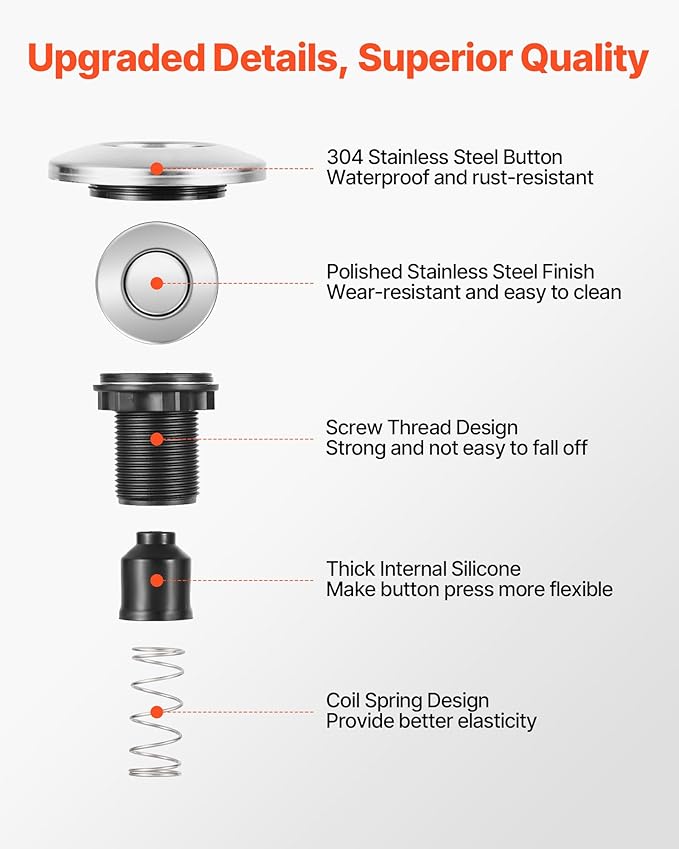 - Durable & Safe: Made with waterproof, polished stainless steel cover, the air push button for garbage disposal resists rust and wear. It's responsive to press - gently press to turn on the garbage disposal, and press again to turn it off