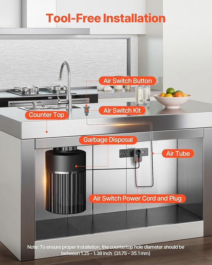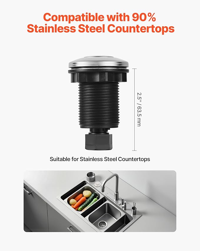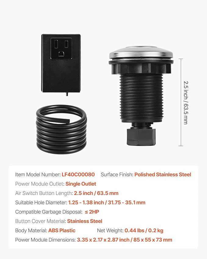- Wide Compatibility: This VEVOR garbage disposal air switch kit fits standard sink hole diameters of 1.25–1.38 inch / 31.75–35.1 mm. The air switch button is 2.5 inch / 63.5 mm long, suitable for stainless steel sink countertops and compatible with most garbage disposal brands (≤2HP).