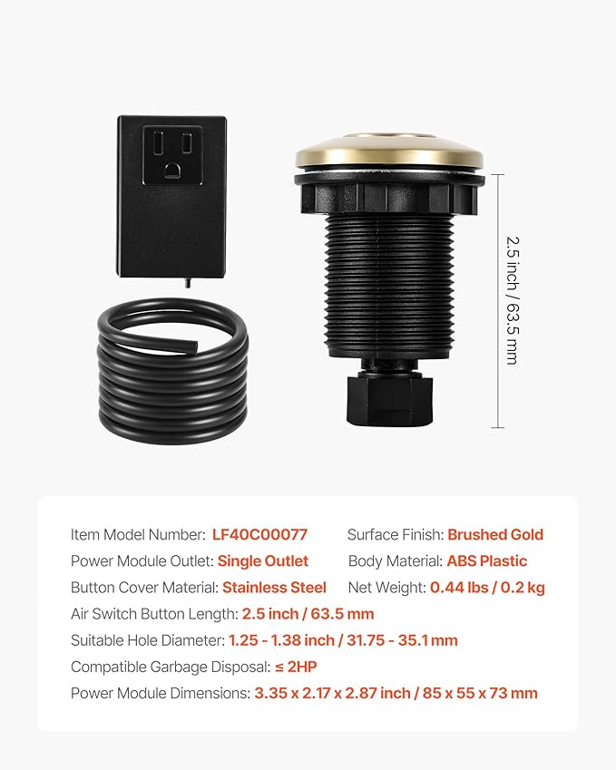 - Wide Compatibility: This VEVOR garbage disposal air switch kit fits standard sink hole diameters of 1.25–1.38 inch / 31.75–35.1 mm. The air switch button is 2.5 inch / 63.5 mm long, suitable for stainless steel sink countertops and compatible with most garbage disposal brands (≤2HP)