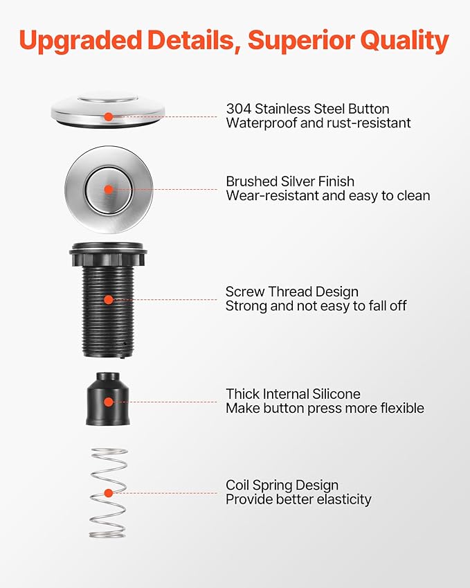 - Durable & Safe: The cover of the garbage disposal air switch button is made of waterproof stainless steel with a brushed silver finish, resistant to rust and wear. It's responsive to press - gently press to turn on the garbage disposal, and press again to turn it off