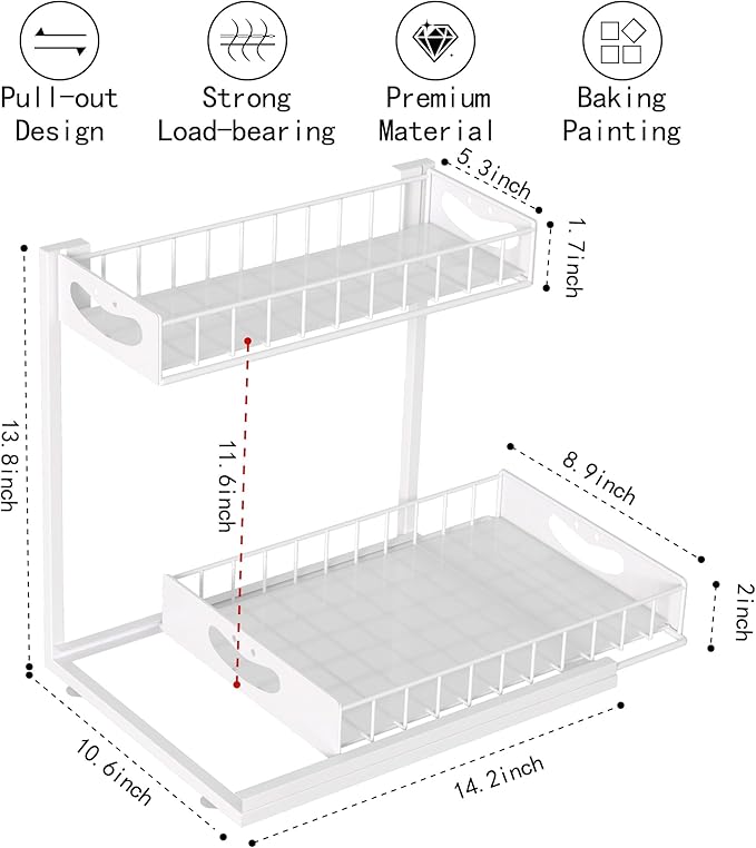 - 2-Tier Pull-Out Design: Our Pull out cabinet organizer Features sliding drawers with a top and bottom basket, providing easy access to your items and maximizing storage space.Suitable for storage and organization at home storage cabinet , kitchen organization,closet organizers and storage.
