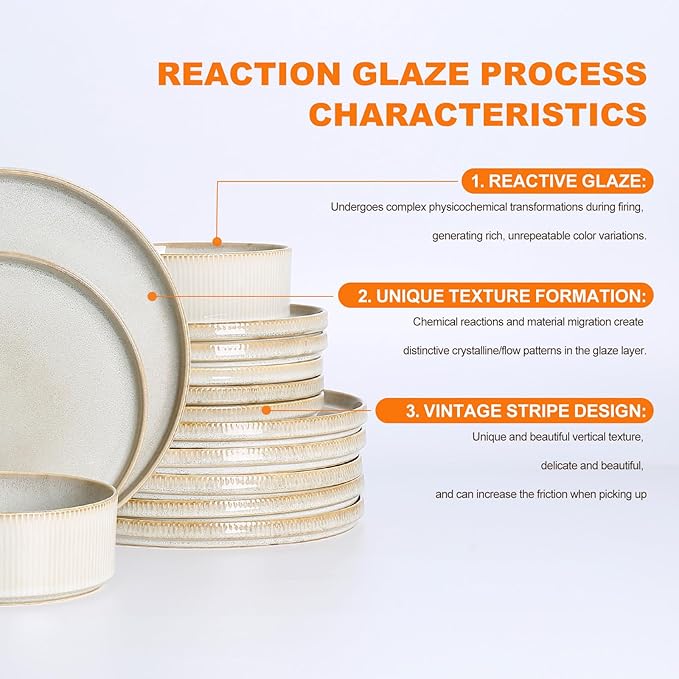 - Unique Dual Reactive Glaze & Retro Stripes:The dishes set for 6 featuring a one-of-a-kind dual reactive glaze surface and handcrafted vintage stripe design, each piece boasts unpredictable color variations and artistic depth, transforming your table into a gallery of natural elegance. Perfect for adding rustic charm to modern dining