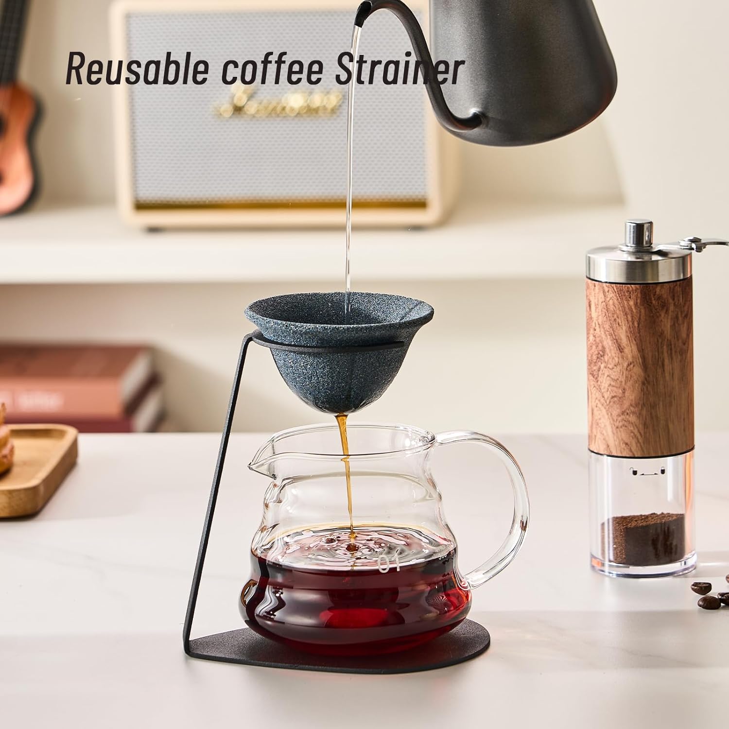 - 【Reusable Ceramic Filter & Sturdy Iron Stand】This complete Japanese-style pour-over set includes a ceramic pour over coffee dripper, iron stand, and carafe. The permanent, reusable ceramic coffee filter cuts paper filter use—unlike traditional drip coffee maker or basic pour over coffee maker setups—to reduce paper waste, cost-saving brew. The minimalist iron stand ensures stability and adds elegance to your kitchen.