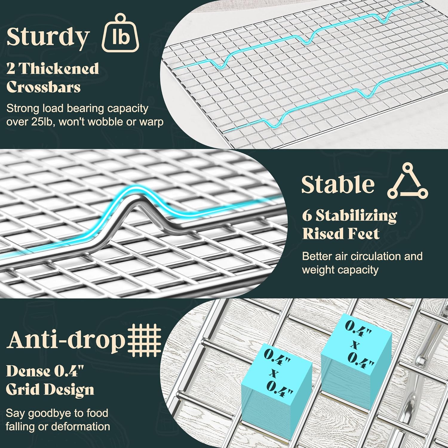 - TRUSTWORTHY MATERIALS: Our wire cooling rack is made entirely of food-grade 304 stainless steel, with narrow mesh, smooth edges, and uniquely designed vertical support rods, making our racks more heavy-duty and more stable