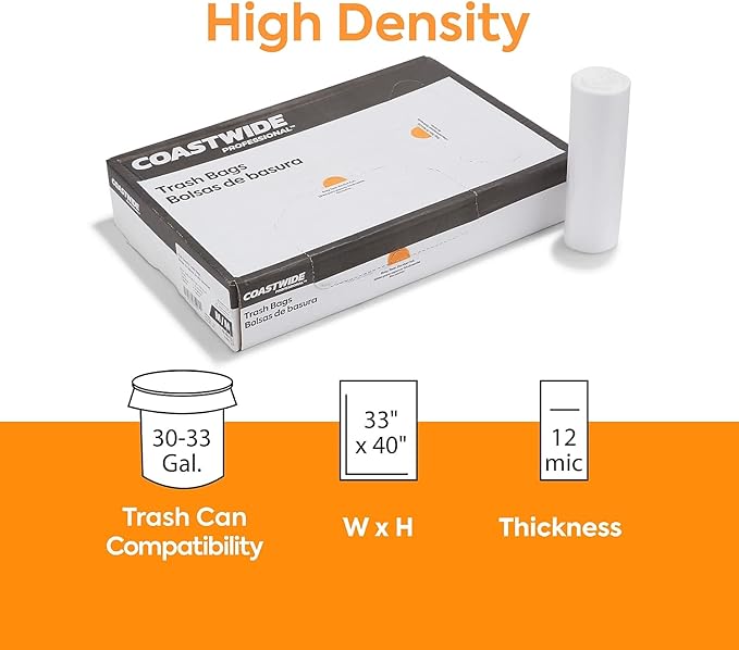 30-33 Gallon Trash Bag, 33" x 40", High Density, 12 mic, Natural, 250 Bags (CW18199)