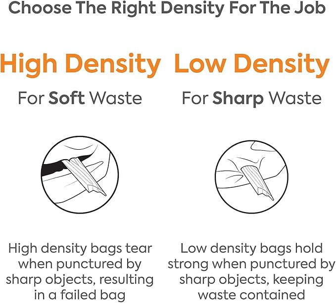 - High density and 12 mic. thick bags are best suited for heavy loads without rough edges, such as paper and light waste