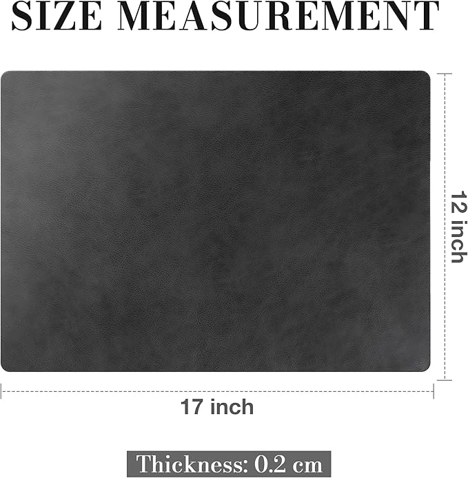 - Tough & Table-Ready: Made with thick, textured PU faux leather (0.08 inch/ 0.2cm), these wipeable mats guard against hot pans, spills, and scratches while keeping a slim profile. Waterproof surface shrugs off wine, grease, and coffee messes in one swipe, survives temps up to 212°F/100℃, and resists daily wear. The smooth matte finish adds modern flair and stays crisp-looking even after heavy use. Sized at 17 x12 inch to fit everything from breakfast nooks to holiday feasts