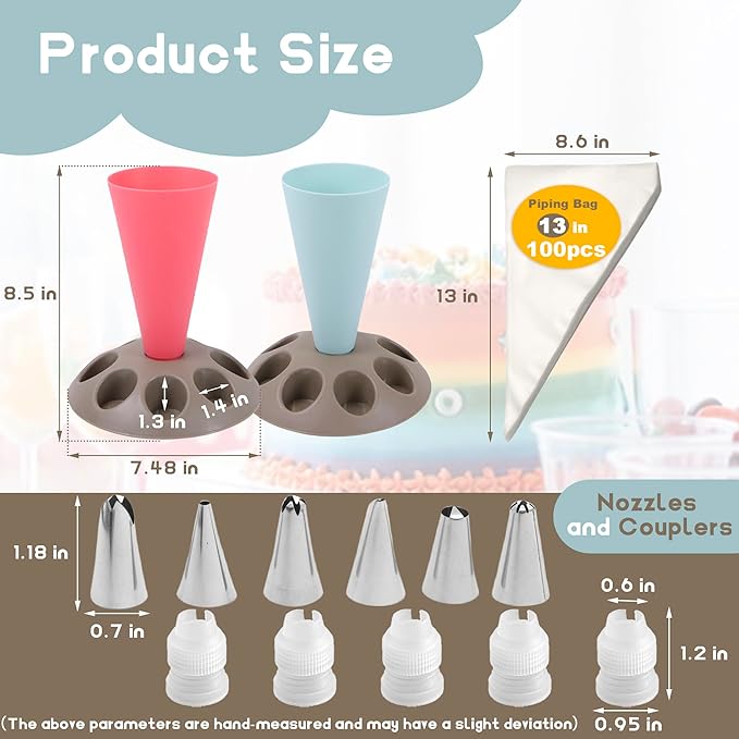 - Complete Baking Set for Decorators – Comes with 2 Pack Piping Bag Stand,100 disposable 13-inch piping bags, 6 Icing Nozzles, and 5 Couplers, making it the ultimate solution for cake lovers