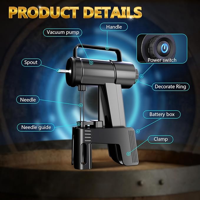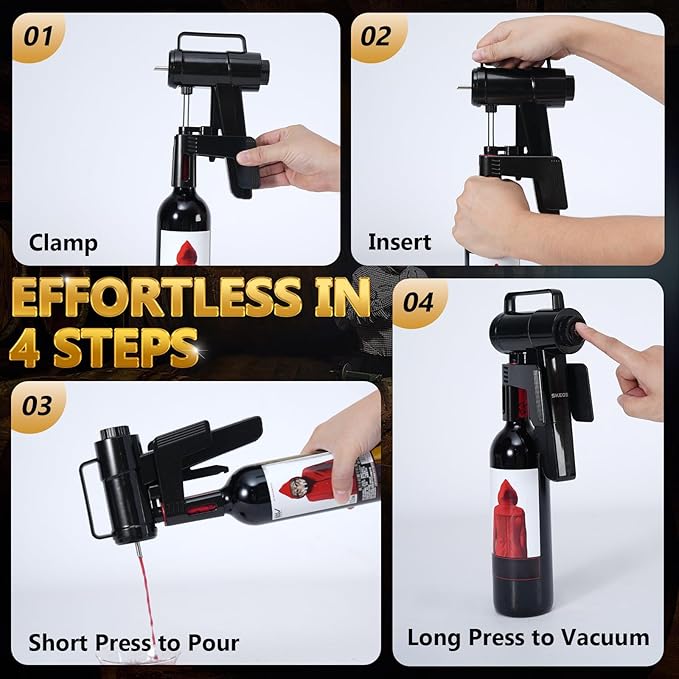 - DUAL-NEEDLE DESIGN – This Vacuum Wine Opener features a unique front and rear needle system. The front needle pours wine smoothly, while the rear needle controls air pressure for vacuum sealing, ensuring no cork damage.