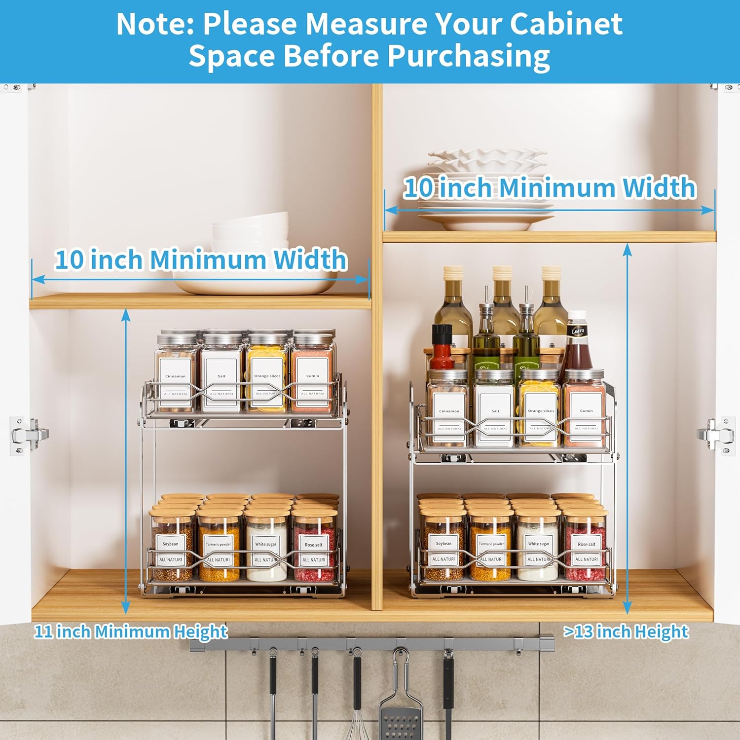 - Two Installation Options: The 2 tier pull out spice rack organizer for cabinet, making it an ideal choice for virtually any cabinet. We provide detailed assembly and installation instructions. Assemble the seasoning organizer effortlessly in minutes. If you prefer not to drill holes in your cabinet, we also offer adhesive mounting for hassle-free installation!