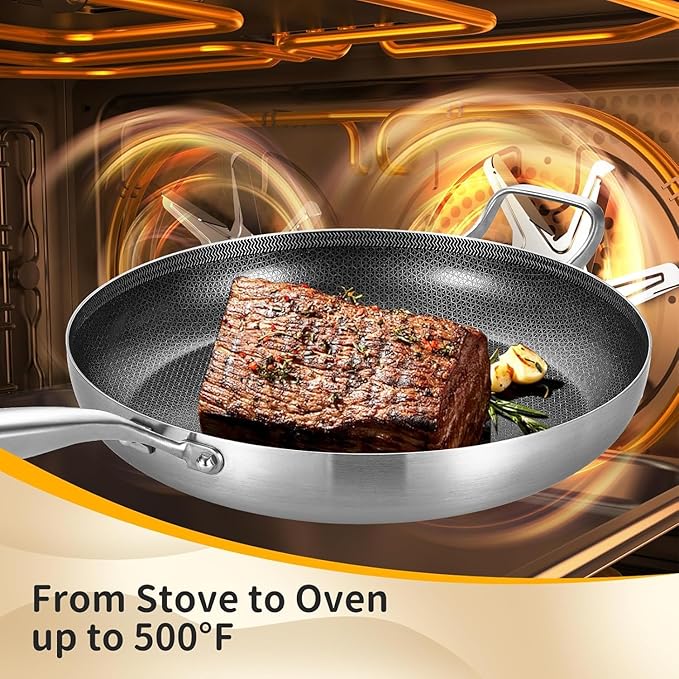 - The high quality durable tri-ply clad make the pan dishwasher-safe and oven-safe up to 500°F,it's your good cooking helper