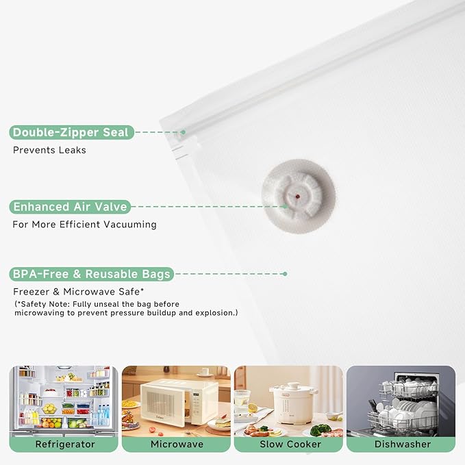- [Upgraded Reusable Bags]: Our food vacuum sealer machine comes with eco-friendly, BPA-free vacuum bags that are washable, resealable, and safe for the dishwasher, freezer, and microwave. These leak-proof, odorless bags lock in freshness and flavor with zero waste.