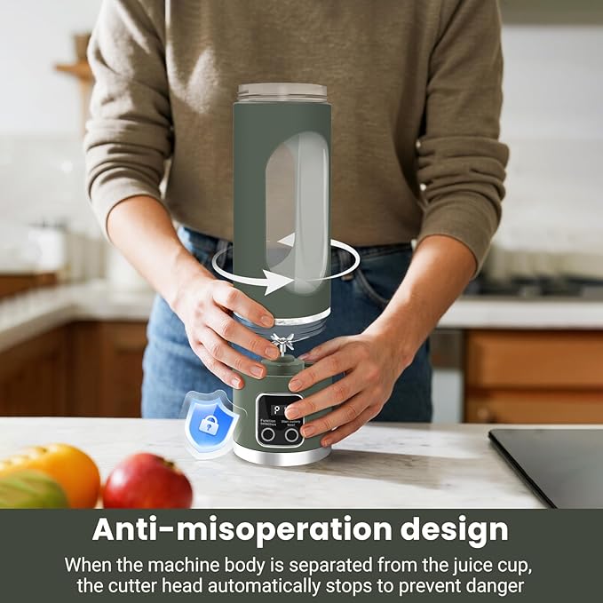 - 【Smart Safety Protective Design】The cup and machine use a clutch transmission mode for safe and reliable operation, with a double protection switch to ensure the machine cannot start accidentally. Portable blender is built-in safety features, Magnetic sensing switch ultra safe to use and clean, the juicer cup will stop working when body and bottom separated,Prevent injuries and use more safely!