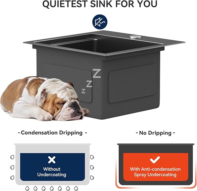 - Quiet Use + Fast Drainage. We hate loud sinks that echo and condensation that ruins cabinets, so we added an anti-condensation coating on the bottom (prevents water droplets from dripping into cabinets, water damage) and thick rubber padding (washes feel whisper-quiet—great for late-night snack prep). The 3.5-inch drain fits almost all garbage disposals and kitchen gadgets, and the slightly tilted bottom drains water fast—no standing puddles to wipe up later.