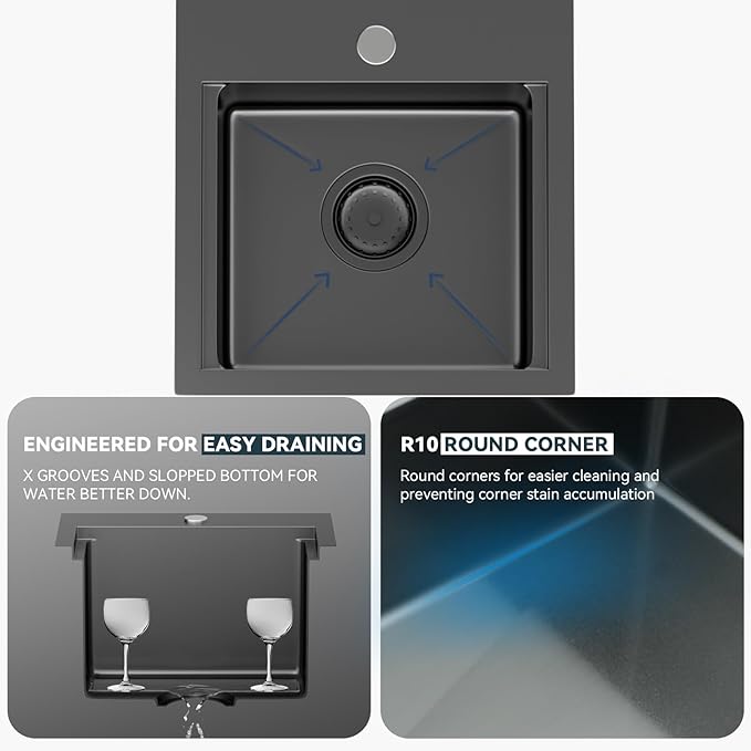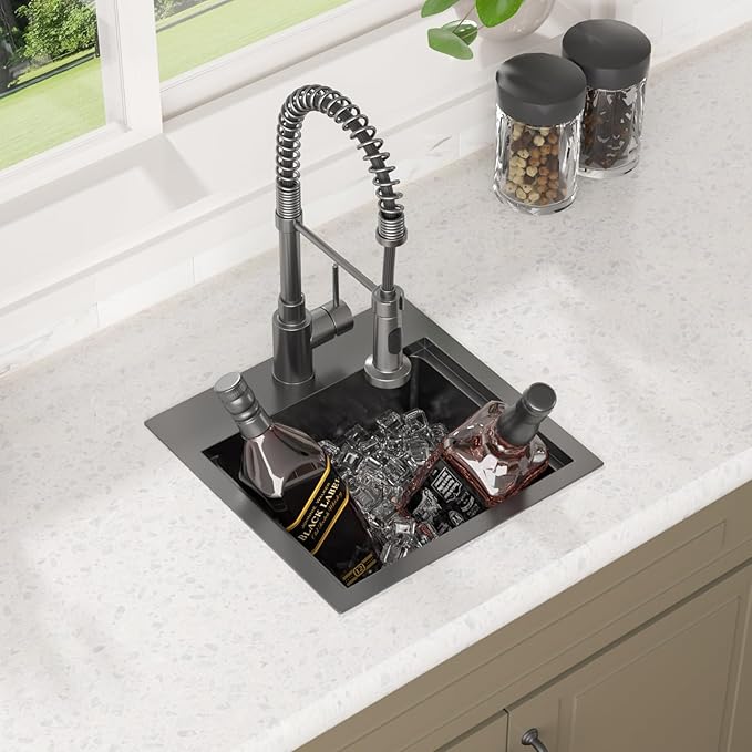 - Sleek Black Nano-Coating. More Than Just Looks! Our black bar sink features a high-quality black nano-coating that‘s built to handle real kitchen life. Unlike regular painted sinks that chip or fade fast, this nano-coating offers: Super easy cleanup: Spills, oil, or food residue wipe away in seconds with a damp cloth. NOTE: Daily use (like setting metal pots or sliding utensils) won’t leave ugly marks, and it fights rust from water or wet sponges, keeping the sink looking new for years.