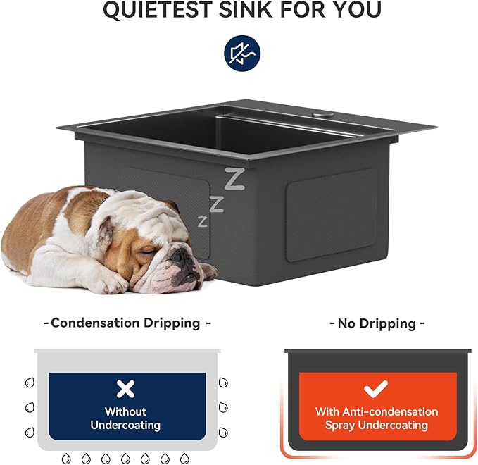 - Quiet Use + Fast Drainage. We hate loud sinks that echo and condensation that ruins cabinets, so we added an anti-condensation coating on the bottom (prevents water droplets from dripping into cabinets, water damage) and thick rubber padding (washes feel whisper-quiet—great for late-night snack prep). The 3.5-inch drain fits almost all garbage disposals and kitchen gadgets, and the slightly tilted bottom drains water fast—no standing puddles to wipe up later.