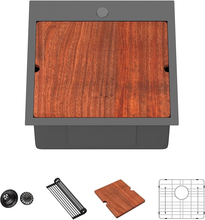 - Perfect Size + Full Accessories. Measuring 18x18x9 inches (fits 21 inch minimum cabinet bases, please check your space), our drop in bar sink comes with all the accessories you need to start using it right away: a cutting board (chop veggies directly over the sink to reduce mess), a roll-up rack (air-dry dishes or set wet pots), bottom rinse grids (protect the sink from scratches), a basket drain assembly (catches food scraps to prevent clogs), plus a cutout template and mounting clips.