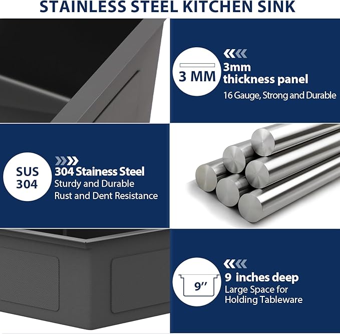 - Premium Quality That Lasts. Our Lordear stainless steel bar sink is built with 16-gauge T304 stainless steel—the same tough material trusted for outdoor grills and restaurant kitchens. This extra-thick design means no annoying dents from dropping pots or utensils, and way less noise when you’re rinsing veggies or scrubbing pans (so your morning coffee routine stays quiet). It’s durable and functional, so this sink won’t let you down for years.