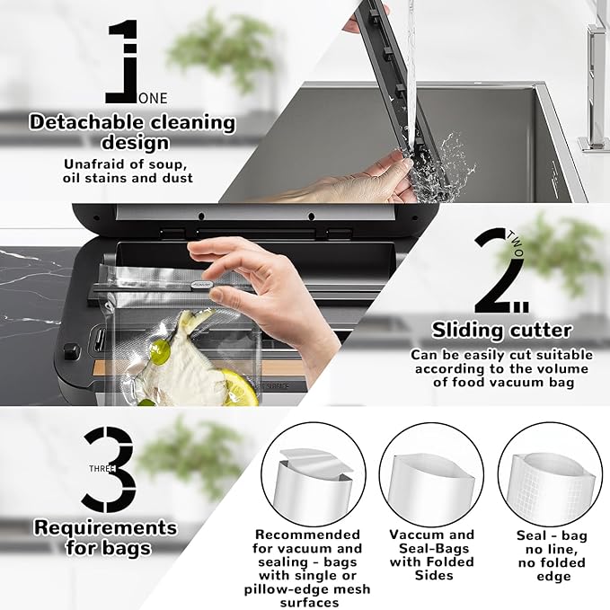 - 【BUILT-IN CUTTER & ROLL STORAGE +SAFETY】Features a built-in bag roll storage compartment and a sharp integrated cutter for creating custom-sized bags on the spot minimizing waste The removable drip tray ensures easy cleaning Complies with strict safety standards backed