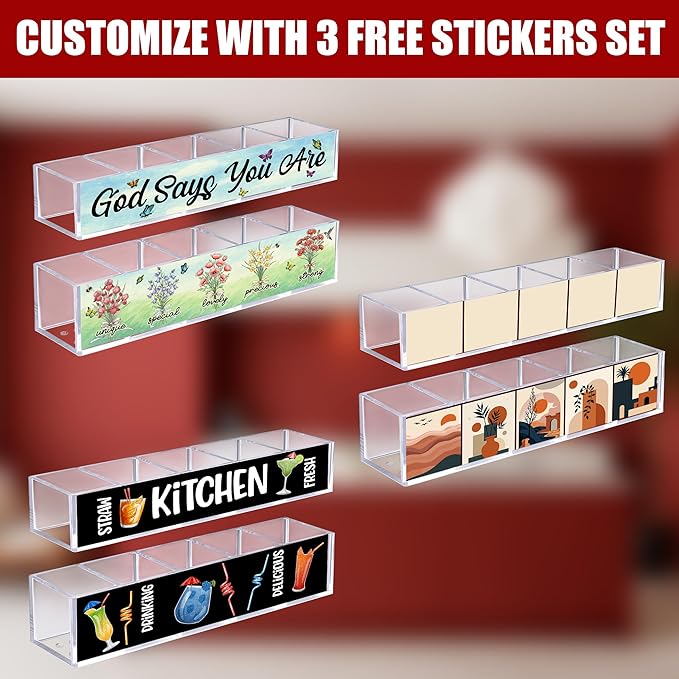 - Includes 3 Decorative Sticker Sets: Personalize your straw holder with functional labels for size, type, or user. Adds both style and organization to your kitchen accessories while making it uniquely yours.