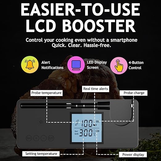 - đșLCD Booster Display â Instant Read, No Phone Needed: Our cooking thermometer allows you to check real-time temperatures directly on the LCD screen, even without your phone. Get fast, accurate readings like a professional BBQ thermometer.