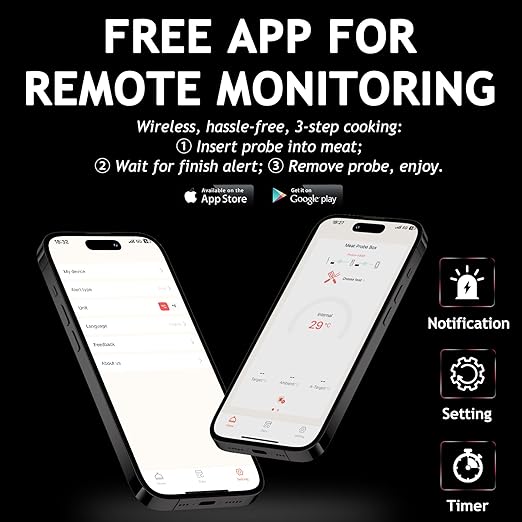 - 🔗 100% Wire-Free Meat Thermometer Probe with Safe Needle: No wires to get tangled or limit your cooking. Our food thermometer features a fully wireless probe with food-grade and 5.5mm ultra-thin stainless steel needle—easy to insert.