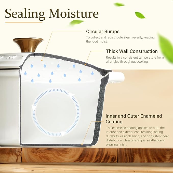 - Effortless Cleaning & Safety First: The flat and smooth enamel surface not only delivers a superior cooking experience but also makes cleaning a breeze. Easily remove food residues with a gentle wipe from a soft sponge or cloth. Additionally, we've included a cotton heat-resistant cap, ensuring a comfortable grip and safeguarding you from burns when handling the pot's handles and lid.