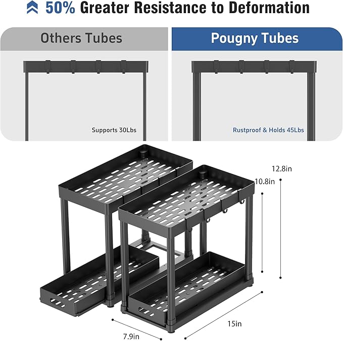 - 【2-Pack Anti-Slip Under Sink Organizers】Secure your space with 2 POUGNY cabinet organizers! Sized at 15” x 7.9” x 12.8”, our under sink storage fits perfectly around pipes, maximizing kitchen/bathroom cabinet storage without sliding.