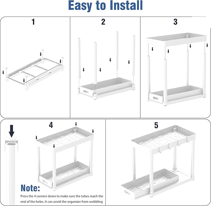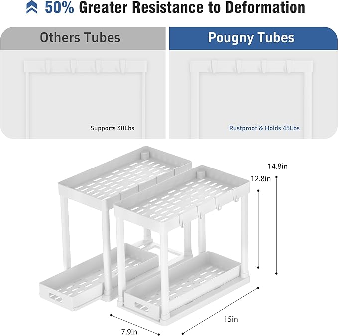 - 【2-Pack Anti-Slip Under Sink Organizers】Secure your space with 2 POUGNY cabinet organizers! Sized at 15” x 7.9” x 14.8”, our under sink storage fits perfectly around pipes, maximizing kitchen/bathroom cabinet storage without sliding.