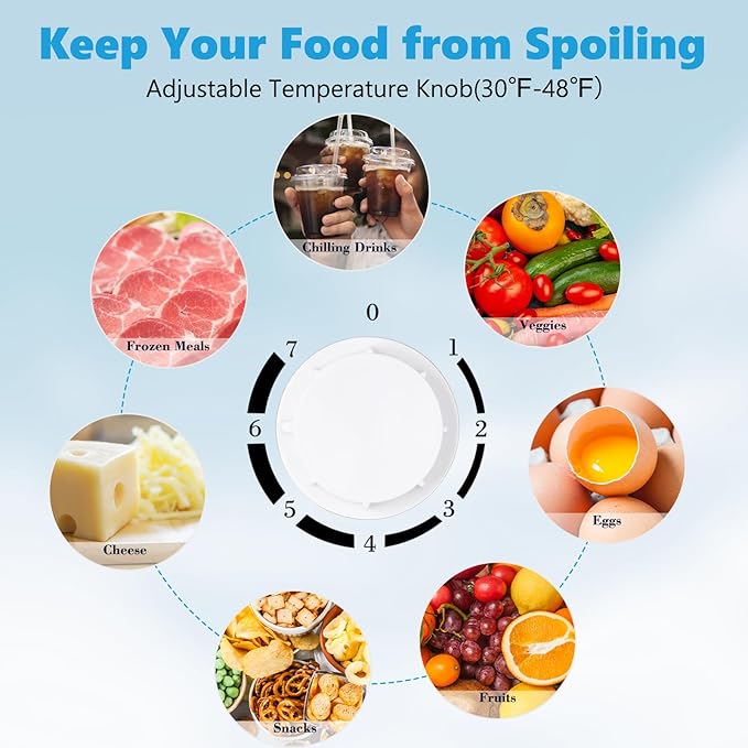 - š°ššØš°šš«šš®š„ šššš«š¢š šš«ššš¢šØš§ šššš”š§šØš„šØš š²: This Mini Fridge has a rotary thermostat button inside. The freezer has a temperature range of 32°F to 50°F (not suitable for storing ice cream) and the fridge offers 7 variable temperature settings depending on your needs. Cold storage and larger freezer compartment for storing beverages, fruits, face masks or a small amount of frozen food.