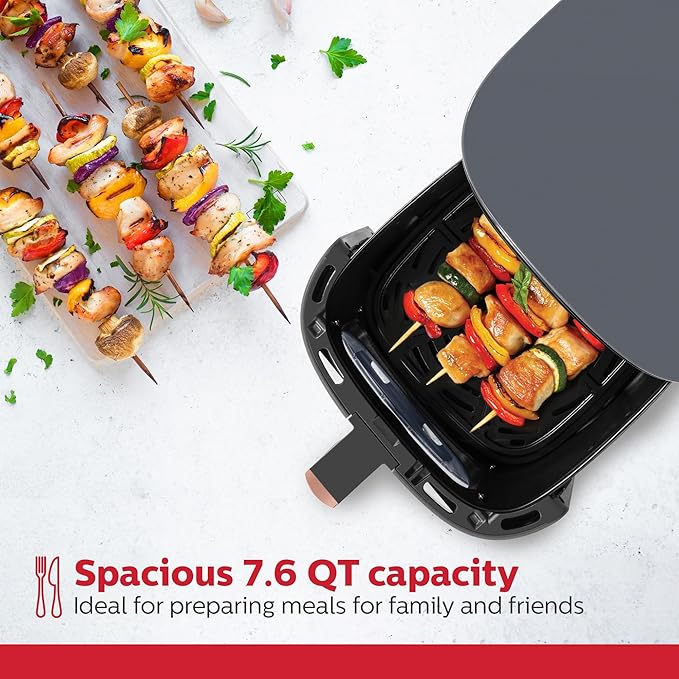 - Large 7.6 QT family-size capacity: Cook healthier meals or snacks for family and friends with this digital air fryer designed for frying, baking, roasting, grilling, and dehydrating.