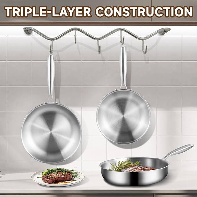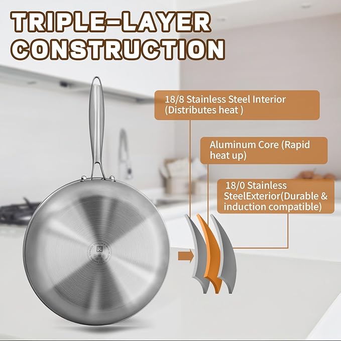 - 【Heats Evenly & Efficiently】This stainless steel frying pan features a food-grade 304 stainless steel cooking surface, an aluminum core, and an 18/0 stainless steel outer layer. This three-layer structure ensures quick and even heating, preventing uneven heat distribution at the bottom of the pan. Additionally, this metal construction offers greater durability and longevity, making it suitable for long-term use.