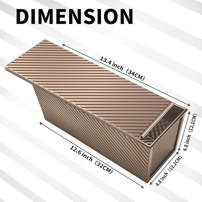 - LARGE SIZE PULLMAN LOAF PAN- The 13"x4" bread pan is made of thicken heavy duty carbon steel, thickened by 0.5 mm, with ventilation holes at the bottom to facilitate air circulation, so that the baking is even and crispy inside and outside, and the material enhances corrosion resistance, superior thermal conductivity, easy maintenance and durability.