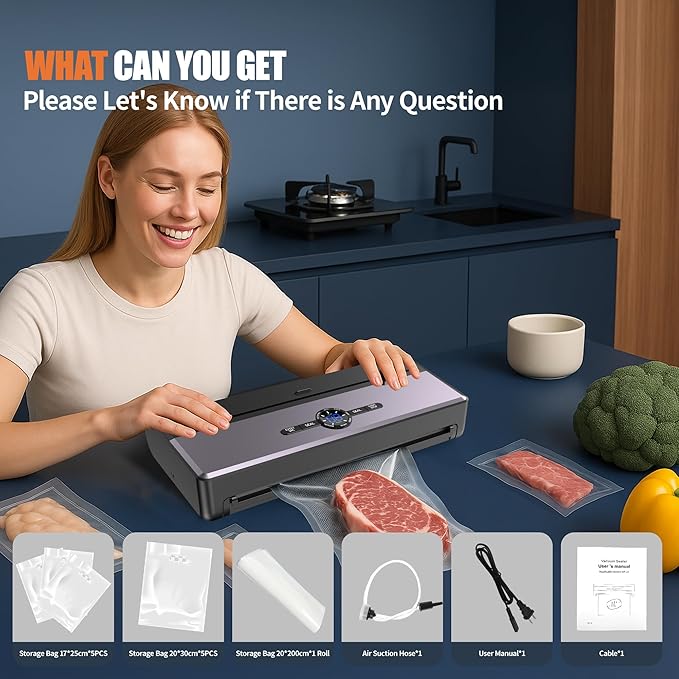 - WHAT YOU WILL GET: This vacuum food sealer saver machine comes with: food vacuum sealer saver machine*1, storage bag 17*25cm*5PCS, storage bag 20*30cm*5PCS, storage bag 20*200cm*1 roll, air suction hose*1, user manual*1, cable*1. An added accessory port and hose open the door to sealing specialized canning jar lids, a wide variety of vacuum-ready containers, resealing wine bottles, and more!