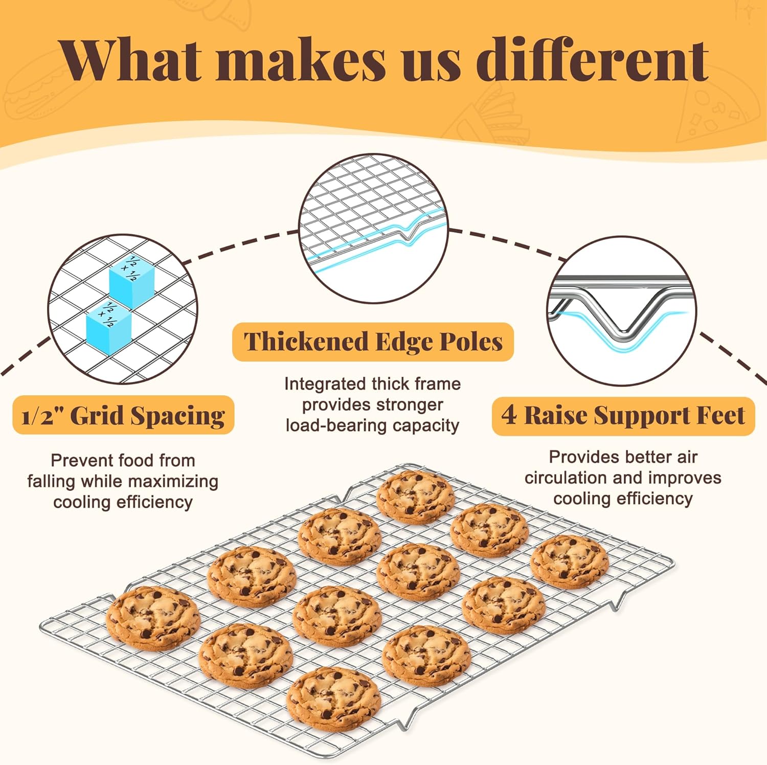 - INTEGRATED SUPPORT FEET: 4 strong support feet integrated with the frame, which can effectively provide load-bearing support and prevent the wire cooling rack for baking from shaking while improving air circulation and accelerating food cooling or draining