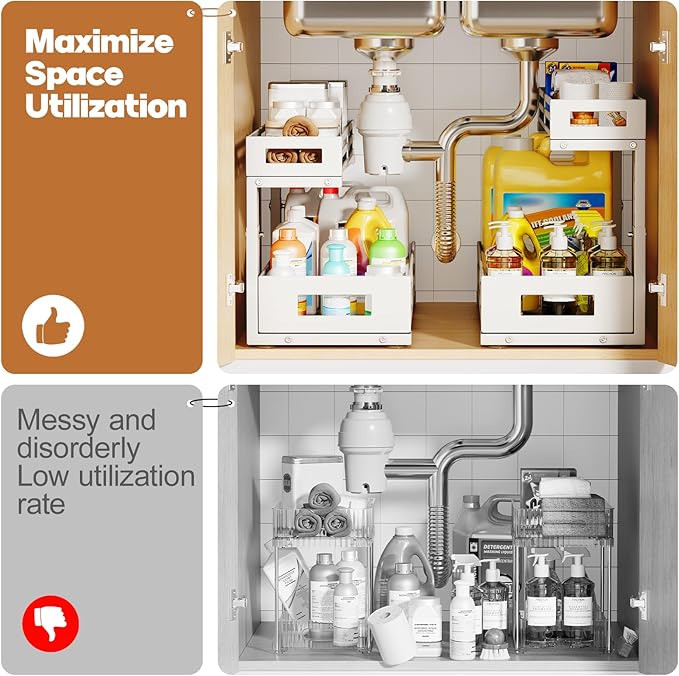 - 【Smart L-Shaped Design 】The innovative L-shaped structure is specially designed to navigate around complicated under-sink obstacles.Whether your cabinet includes a garbage disposal, water filter, or irregular plumbing pipes, this organizer fits snugly without wasting space.Maximize every inch of storage—even in tight, awkward cabinet areas.