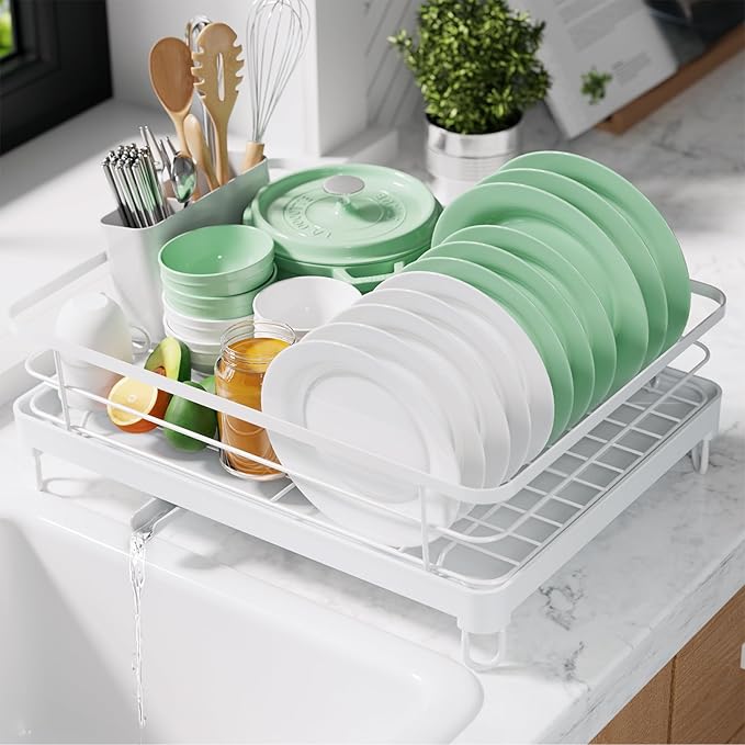 Kitsure Dish Drying Rack for Kitchen Counter, Stainless Steel Sink Organization and Storage Essentials with Cutlery Holder, Home and Appartment Decor, 12.7''W x 16.7''L, White