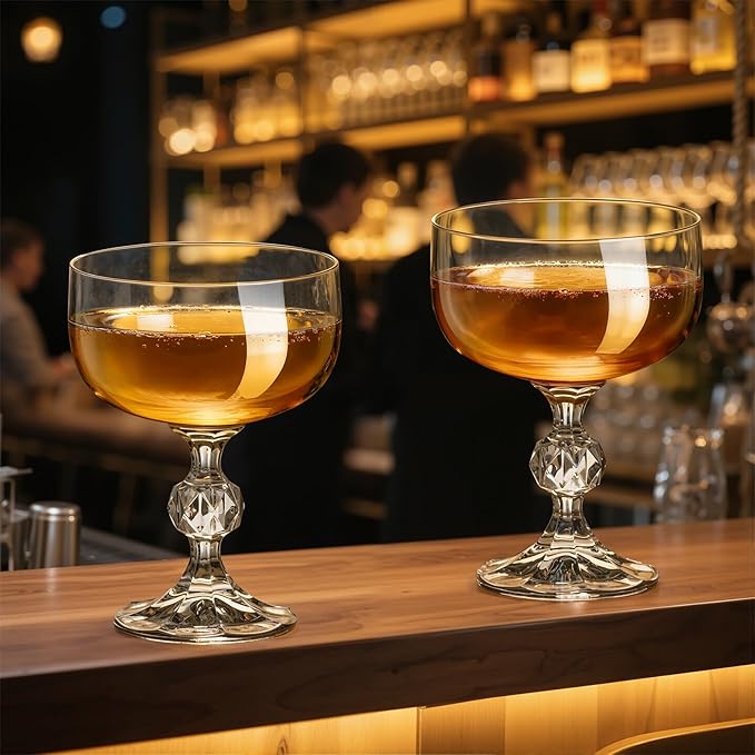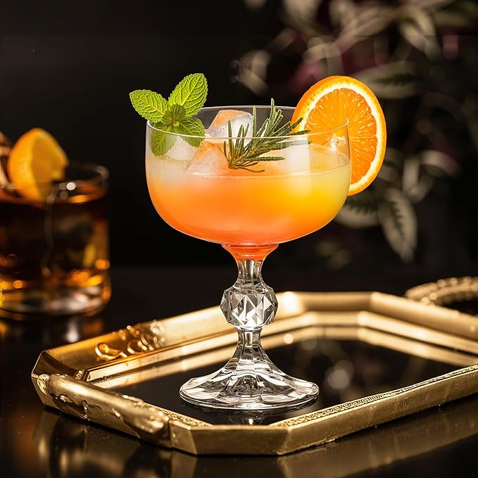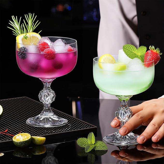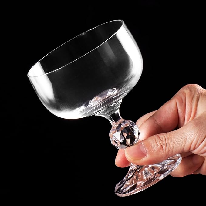 - 【Refined Details】The flat base and broad opening ensure stability, making these champagne glasses ideal for constructing champagne towers. The classic coupe shape exudes vintage elegance while beautifully showcasing layered cocktails, garnishes, or foam. The stem minimizes hand contact, preventing heat transfer for optimal temperature retention. Ergonomically designed, the stem provides a secure and comfortable grip, while the weighted base prevents tipping for worry-free enjoyment of champagne, wine, and cocktails.