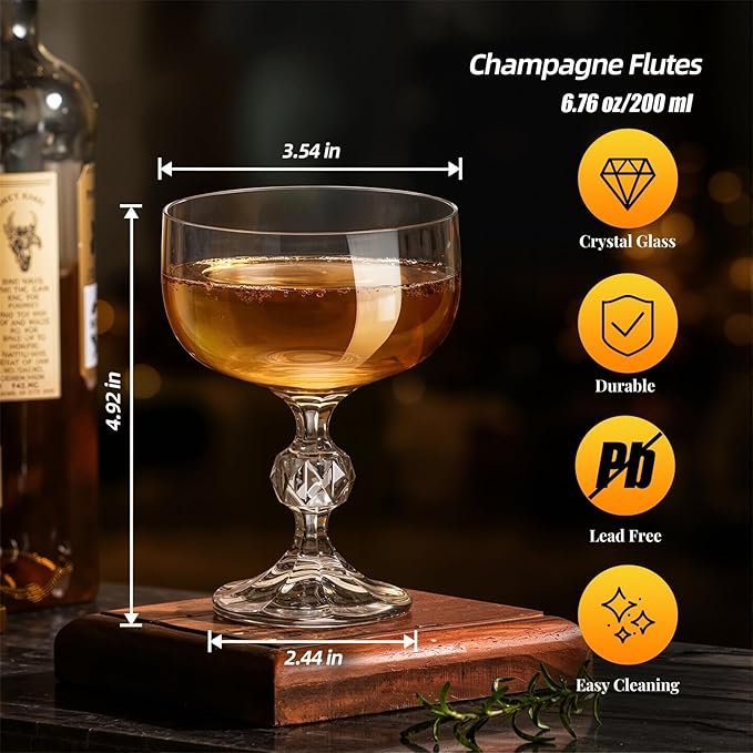 - 【6.7oz Perfect Capacity】With a standard 6.7 volume, these glasses are ideal for champagne, wine, and cocktails—sufficient for toasting yet designed to maintain freshness and crispness. Whether for casual use or special celebrations, this set of 2 glasses ensures an elegant experience.